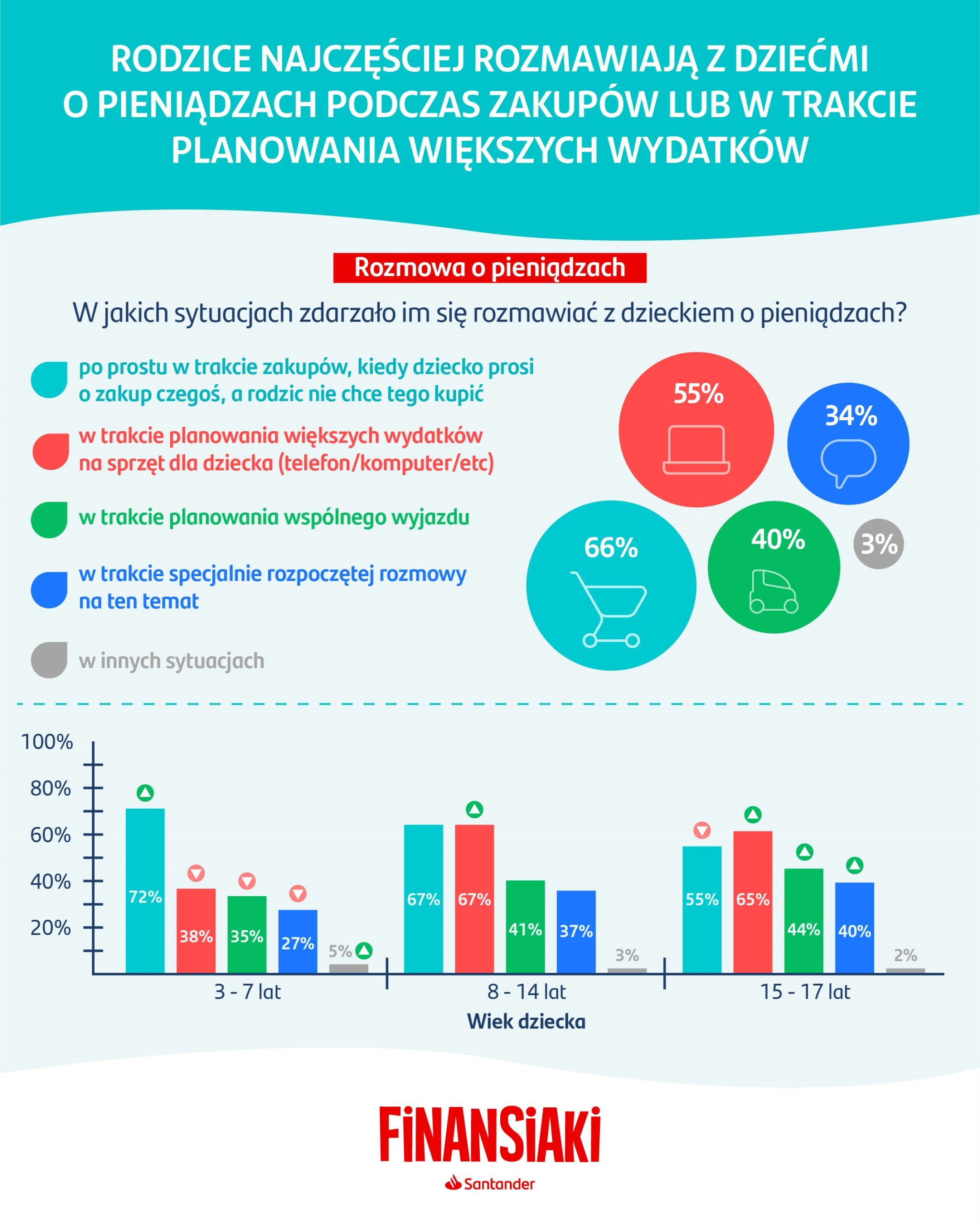 Interestingly, the most common situation when parents decide to talk about money is the child’s request to buy something that the parent does not want to buy, especially among parents of 3-7 year olds. In the case of children over the age of 8, planning to spend more money on equipment for the child, such as a computer or mobile phone, is also a reason to talk about the household budget. For 40% of families, joint trips are a good opportunity to talk about finances.