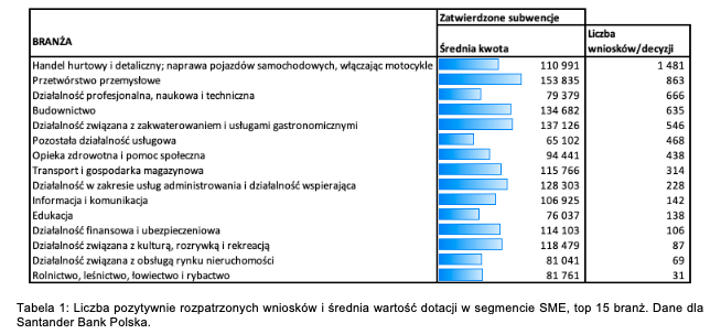 W segmencie mikro, małych i średnich firm najwięcej, bo niemal 1500 pozytywnie rozpatrzonych wniosków o subwencję, dotyczy podmiotów z sektora handlu detalicznego i hurtowego oraz naprawy pojazdów, a także z branży przetwórstwa przemysłowego – 863 pozytywnie rozpatrzone wnioski. Na kolejnych miejscach pod względem liczby przyznanych świadczeń znalazły się firmy prowadzące działalność profesjonalną, naukową i techniczną (666 pozytywnie rozpatrzonych wniosków), firmy z branży budownictwa (635 pozytywnie rozpatrzonych wniosków) oraz świadczące usługi związane z zakwaterowaniem i gastronomią (546 pozytywnie rozpatrzonych wniosków).