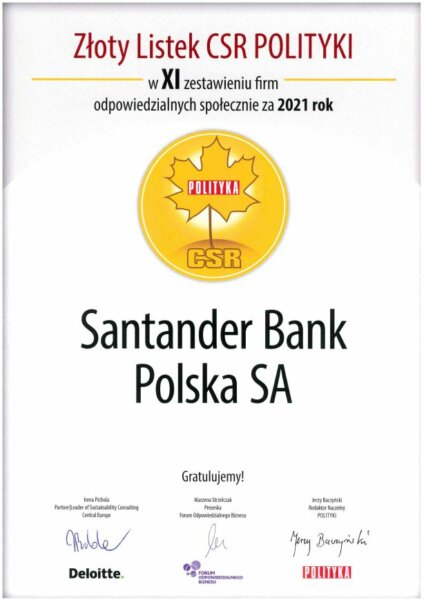 Santander Bank Polska kolejny raz nagrodzony Złotym Listkiem CSR Polityki