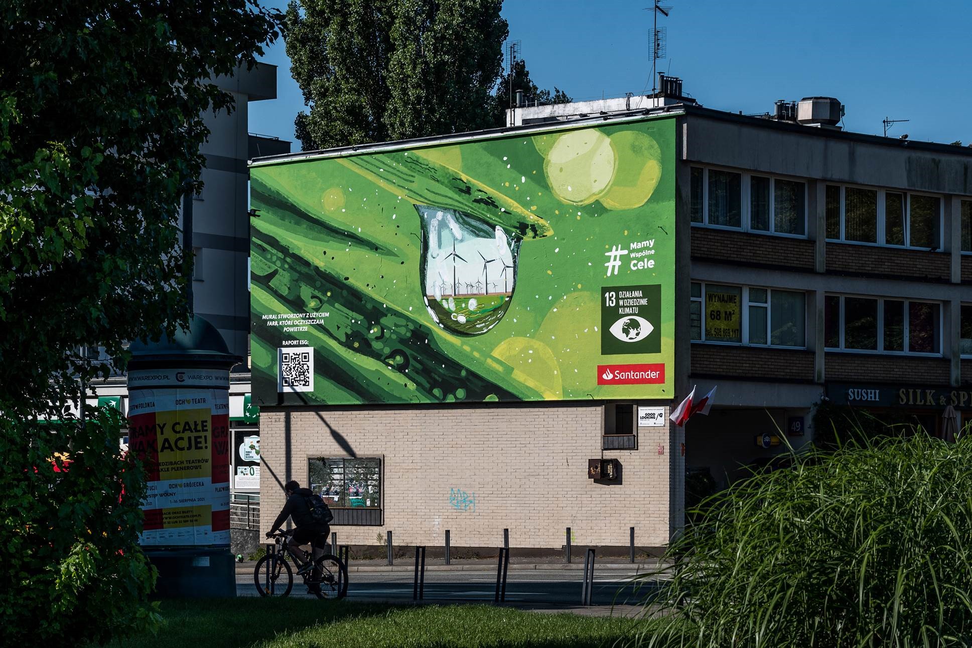 Zdjęcie główne wykorzystane w tegorocznym „Raporcie ESG”, to fotografia, która zwyciężyła w specjalnym konkursie ogłoszonym na profilu Santander Bank Polska na Facebooku – „Zielono mi w obiektywie”. W pierwszym etapie zdjęcia oceniane były przez jury, któremu przewodniczyła Karolina Jonderko, laureatka World Press Photo 2021. Następnie wybrane 4 zdjęcia finałowe, które według jury kreatywnie przedstawiły ochronę klimatu i środowiska naturalnego w Polsce, poddane zostały głosowaniu internautów na profilu banku. Wygrał Tomasz Moczkodan, jego kreatywna praca została zdjęciem głównym Raportu ESG i stała się także inspiracją do stworzenia ekologicznego muralu w Warszawie. Eko mural powstawał 1 sierpnia 2021 roku w Warszawie na ul. Francuskiej, przy rondzie Waszyngtona. Został namalowany fotokatalityczną farbą, która pochłania zanieczyszczenia z powietrza. Mural można oglądać do końca września br.