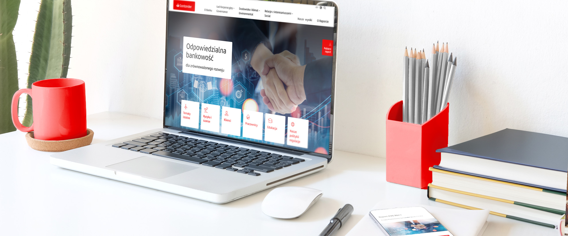 Raport ESG 2023 Grupy Santander Bank Polska jest dostępny w wersji online (https://esg.erste.pl/2023/) oraz w formacie PDF, zarówno w języku polskim, jak i angielskim. Strona z raportem została dostosowana do potrzeb osób niewidomych i niedowidzących. Jest zgodna z międzynarodowym standardem dostępności dla osób o indywidualnych potrzebach (WCAG 2.1 na poziomie AA) i ma certyfikat Fundacji Widzialni.